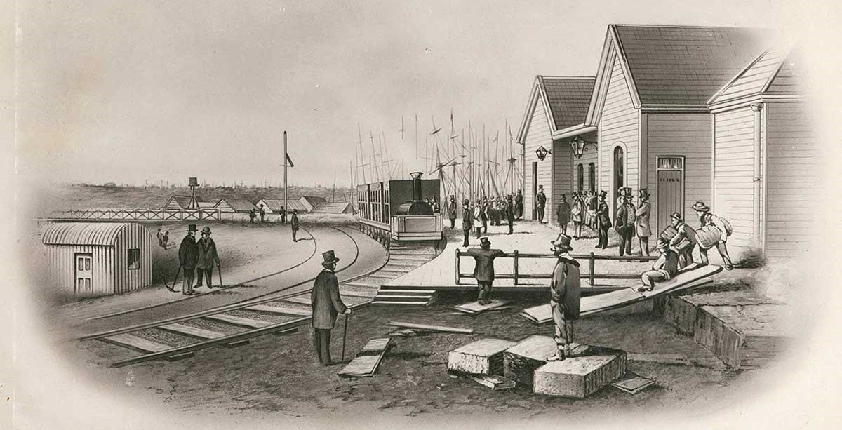 Art: The First Steam Powered Railway in Australia Following the discovery of gold in Victoria in 1849, and the gold rush of 1852/53, the need for an efficient transport link between the port at Sandridge and the city of Melbourne was paramount. The problem was overcome by constructing a privately funded railway that opened in 1854. Other railways soon followed: See the detailed 1864 map of Melbourne by H.L. Cox R.N.